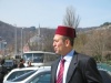 The notorious Ali Yuzeirov is shown walking out of the Shumen hotel wearing a red Turkish fez on the day he attempted to found the Muslim party OTOMAN. Photo by BGNES