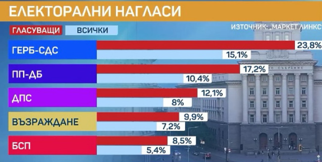 According to the latest poll conducted jointly by bTV and "Market Links," if elections were held today in Bulgaria, the GERB party would lead by more than 6% over We Continue the Change-Democratic Bulgaria (WCC-DB).